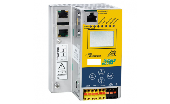 ASi-5/ASi-3 PROFINET Gateway with integrated ASi-5/ASi-3 Safety Monitor, 2 ASi-5/ASi-3 master, OPC UA server, REST API, integrated decoupling, max. 4 A per ASi circuit, ASi current measurement in the gateway, expandable to max. 62 x 2 channels safe inputs, 1922 x 2 channels safe inputs in max. configuration, expandable to max. 64 safe outputs, 1984 safe outputs in max. configuration, Safe Link, diagnostic and configuration via PROFINET or Ethernet diagnostic interface, duplicate address recognition, ASi fault detector, programming in C optional, IP20