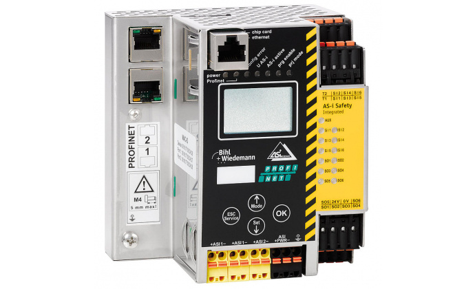 Si-3 PROFIsafe via PROFINET Gateway ze zintegrowanym monitorem bezpieczeństwa, 2 mastery ASi-3, zintegrowane odsprzęganie, maks. 4 A na obwód ASi, pomiar prądu ASi w bramce, 6 wejść cyfrowych lub 3 x 2 kanały bezpiecznych wejść (SIL 3, kat. 4), możliwość rozbudowy do maks. 62 x 2 kanały bezpiecznych wejść, 1922 x 2 kanały bezpiecznych wejść w maksymalnej konfiguracji, 6 obwodów zwalniających (6 x elektroniczne bezpieczne wyjścia), możliwość rozbudowy do maks. 64 bezpiecznych wyjść, 1984 bezpiecznych wyjść w maksymalnej konfiguracji, PROFIsafe (F-CPU i Safe Link, diagnostyka i konfiguracja poprzez interfejs diagnostyczny PROFINET lub Ethernet, rozpoznawanie zduplikowanych adresów, detektor błędów ASi, opcjonalne programowanie w języku C, IP20