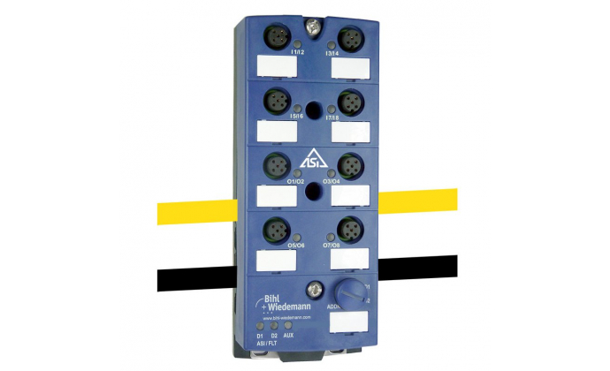ASi Digital I/O Module in IP67, with 8 x M12 sockets, 8 digital inputs, 8 digital outputs, Y wiring, input voltage/sensor supply out of AUX, output voltage/actuator supply out of AUX, periphery connection via 8 x M12 sockets, 5 poles, ASi connection via profile cable and piercing technology, 2 AB addresses